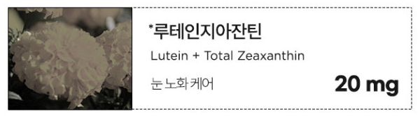 루테인지아잔틴 : 노화로 인해 감소될 수 있 수 있는 황반색소 밀도를 유지하여 눈건강에 도움을 줄 수 있습니다. 루테인지아잔틴은 나이가 들수록 감소되는 것은 물론 몸속에서 자연적으로 합성되지 않기 때문에 반드시 외부로부터 보충되어야 하는 중요한 성분입니다.