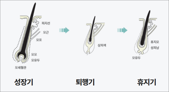 모발은 주기적으로 성장기 / 퇴행기 / 휴지기를 반복하며, 정상적인 조건에서 성장하고 잠시 멈추었다가 빠지고 다시 대체됩니다. 하루에 50~100개 정도의 정상적인 퇴행기 탈모가 일어나며 그 이상인 경우 비정상적인 탈모를 의심할 수 있습니다.