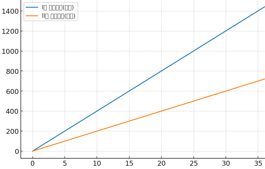 - 가정: I형 월 개인 10만 + 정부 30만, II형 월 개인 10만 + 정부 10만(모두 36개월 동일)